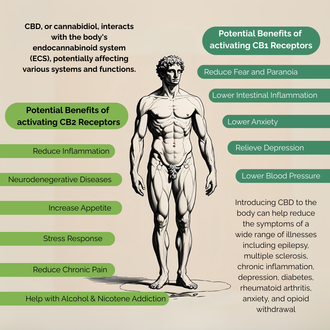 CBD interacts with two sets of cannabinoid receptors in your body—CB1 and CB2. They have a direct effect on specific parts of your body and brain: